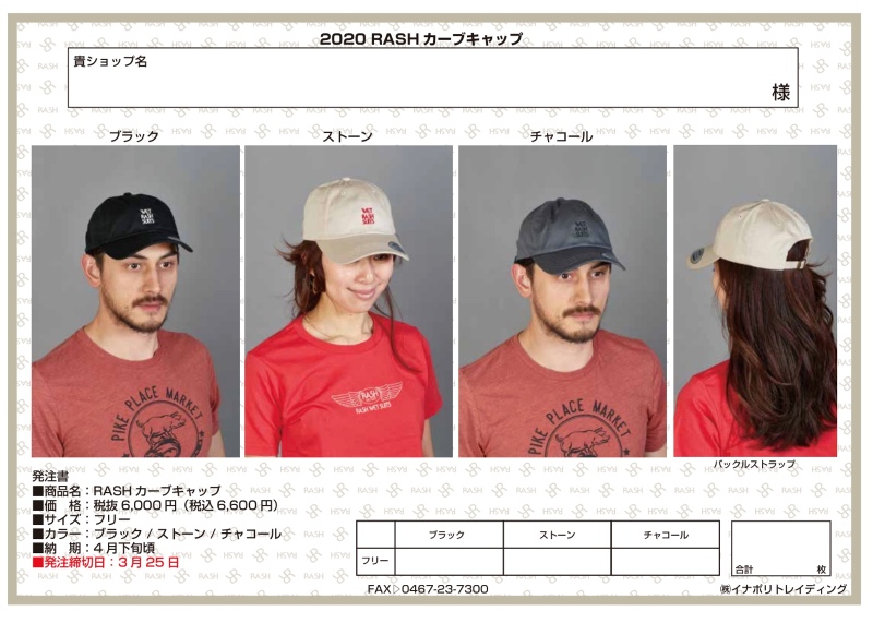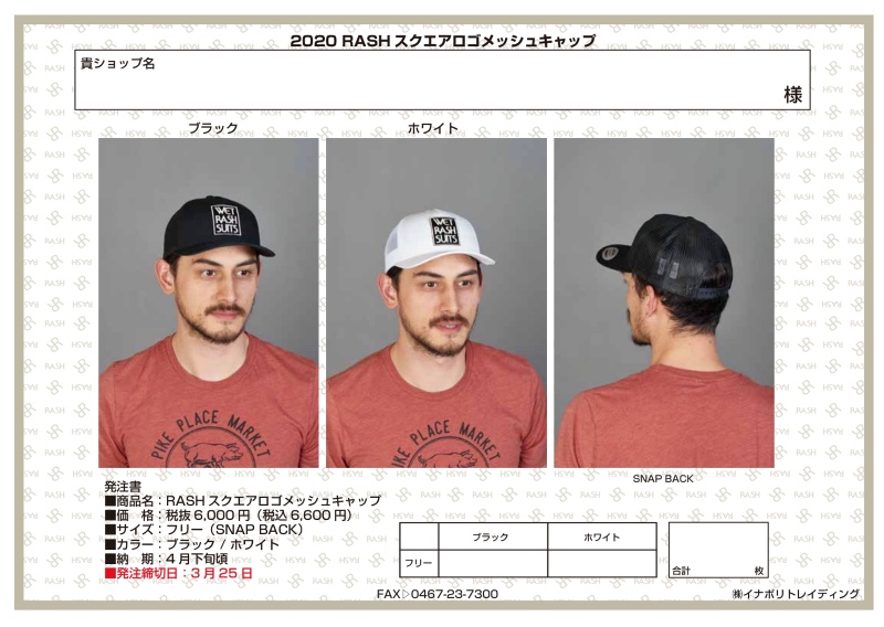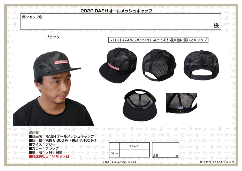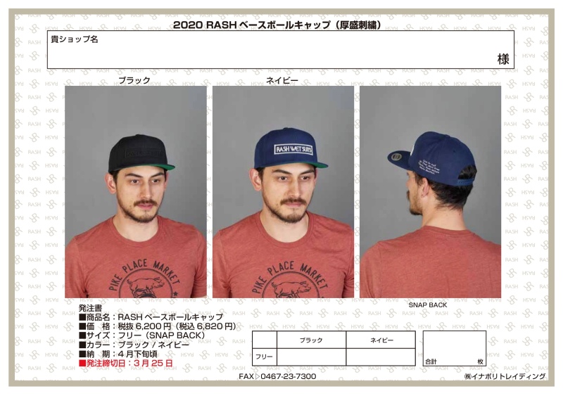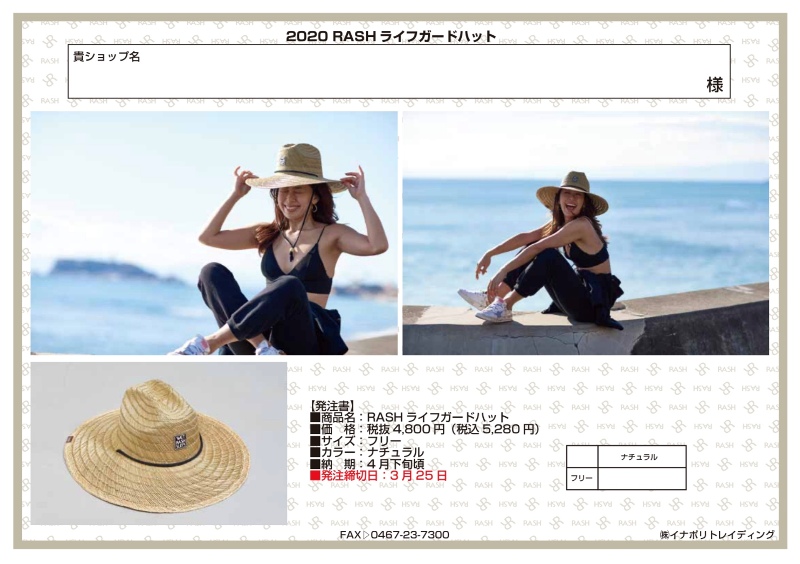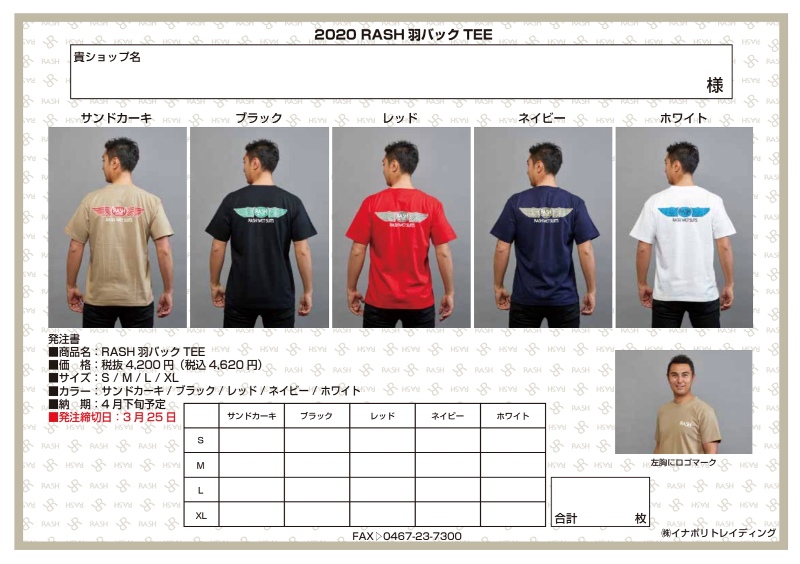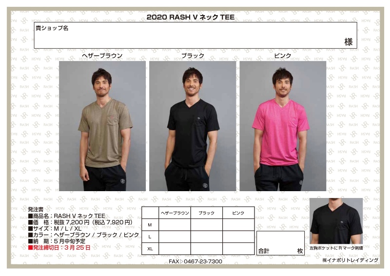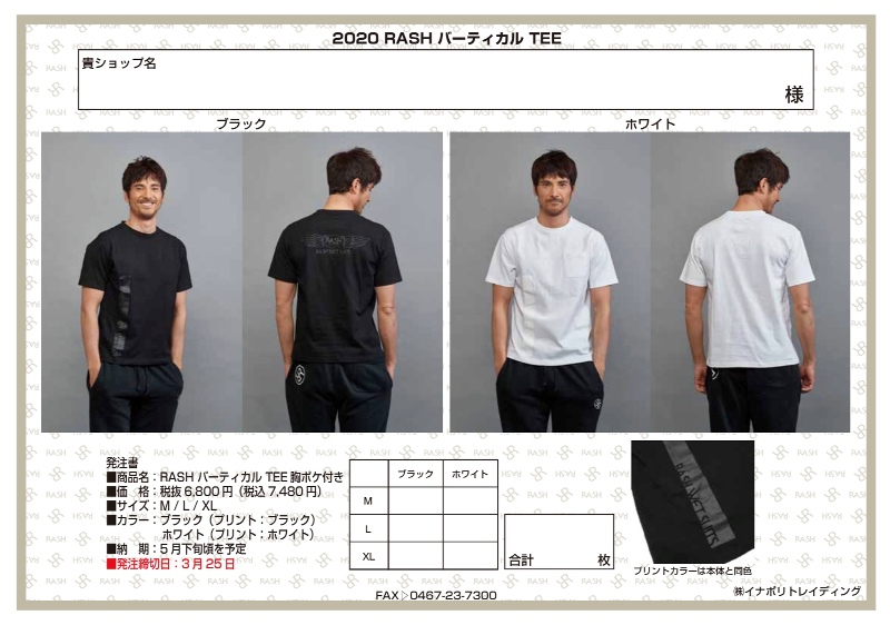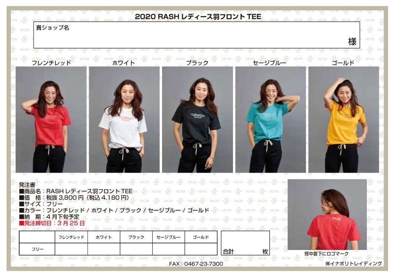 | 2020年4~5月頃に出来上がる予定のラッシュ’20夏物のウエアーです。 3月25日までにお伝えくだされば、前予約割引10%OFFとさせていただきます。 |