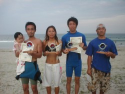 遊び感覚で運動会の様に各クラス参加者全員を 赤・黒の2つの組に分けて団体ポイントもつけます。勝ち組の方には全員に団体賞品があります。 その他、抽選会で豪華景品をプレゼント!鉄板焼き昼食会、など色々予定しています。 前日の18日の日曜日も天気と波に恵まれれば、スクールや試乗会やバーベキューや スケボーでのイメトレスクールなど色々遊びたいと思っています。 皆さんお気軽に参加してください。 |