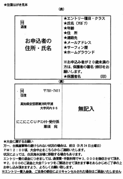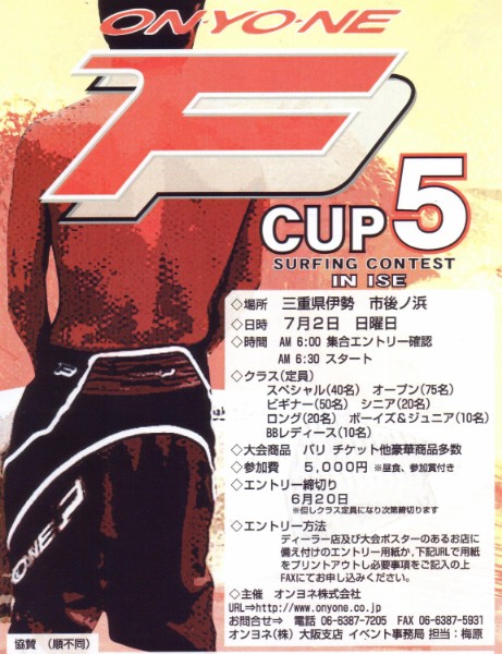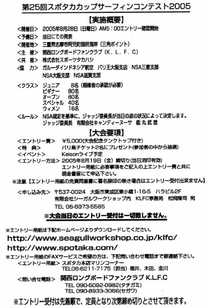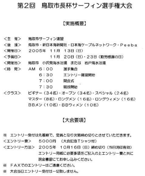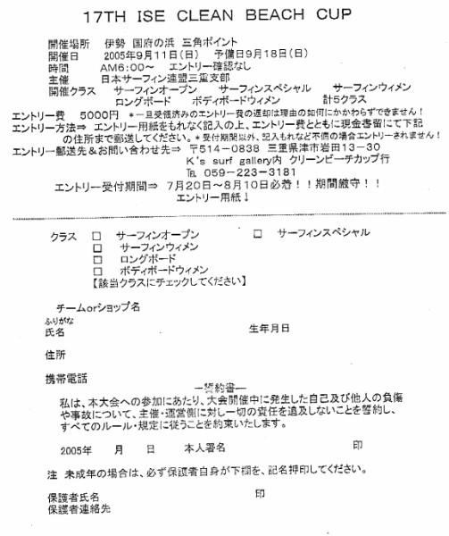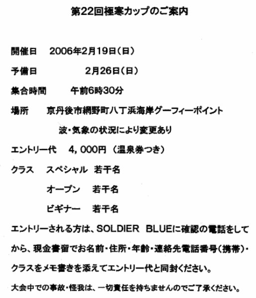 '05年2月6日(日) 第21回 極寒カップ FOR THE FUTURE OF OUR OCEAN エントリー代:¥4000 (温泉券付き) エントリー受付中! *但し、定員になり次第〆切 場所:網野・八丁浜・灯台グーフィー(波の状況により変更あり) |