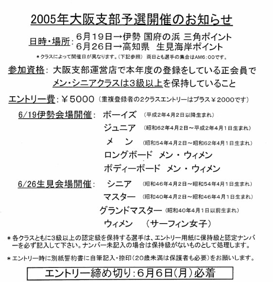 | 今年の西日本選手権大会は8月23〜28日に四国のイクミ海岸で開催されます。 その大阪代表選手を決める大会です。今年はメンとシニアクラスは3級以上取得が 必要ですが、それ以外のクラスはNSA正会員になれば誰でもエントリー可能です。 詳しくはお問い合わせください。→TheBluesurf |