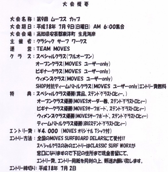 この大会はムーブスサーフボードのユーザーの方を対象に年に一度、毎年開催されていて今年で8回目になります。 会員登録や年会費などの難しい事は何もいらないのですが、スペシャルクラス以外はムーブスサーフボードの 使用者しかエントリーできません。全国のムーブスユーザーのファミリーコンテストのような大会です。なので、 毎年賞品はムーブスファクトリーからのプレゼントの意味も込めて? けっこういい物が出ています。 各クラスにサーフボードも出るので、ムーブスを乗っている方にはエントリーの価値・特大です。 |
