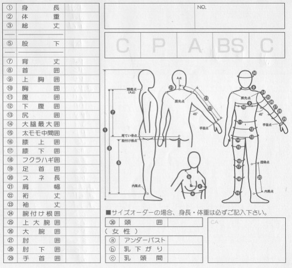 ↑日本ウエットスーツ工業会発行の採寸表です。↑